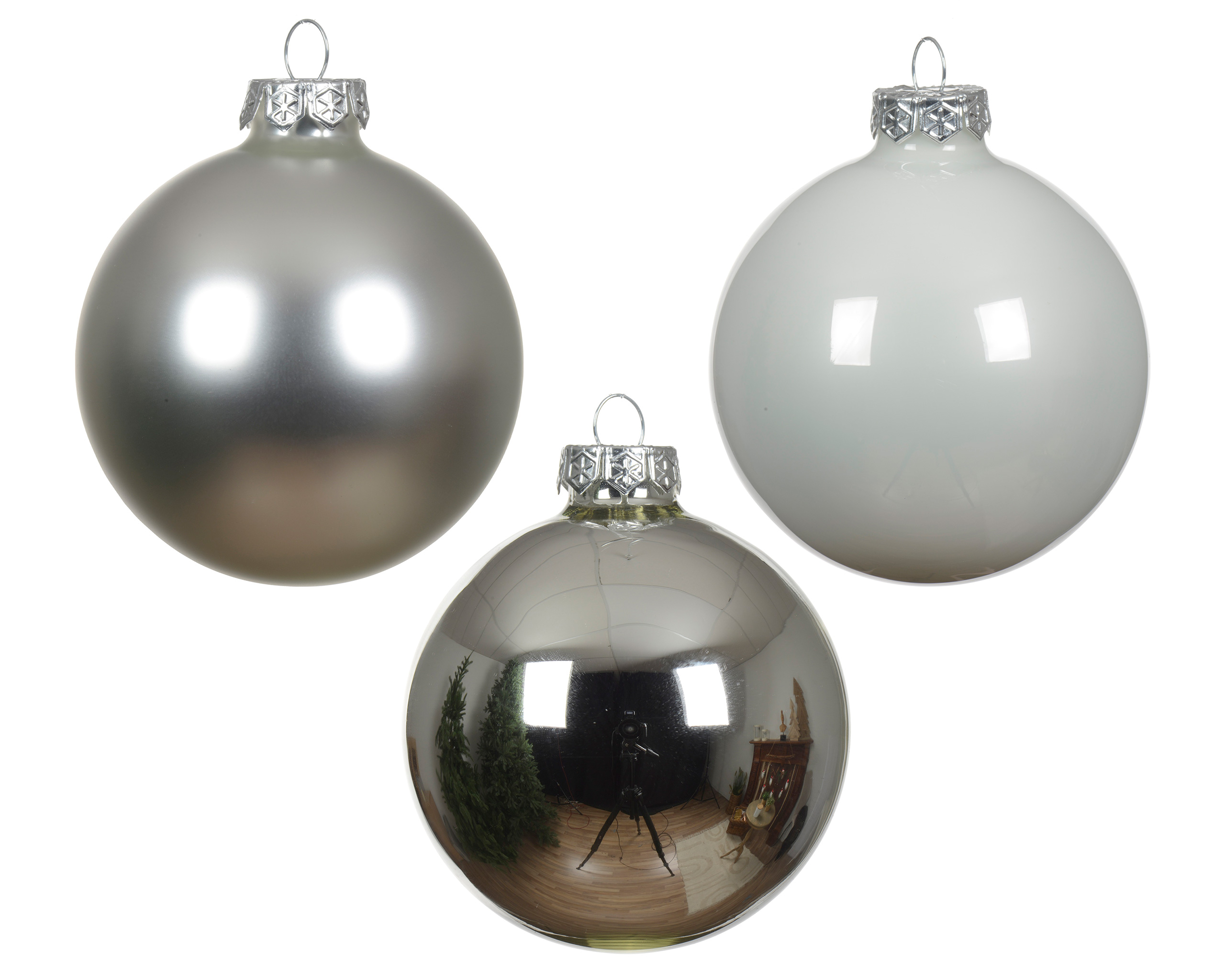 PRODUKT: Große Weihnachtskugeln / DURCHMESSER: ca. 8 cm / MATERIAL: Glas / Inhalt: 16 Kugeln / Farbe: Mix aus winterweiß - weiß und silber