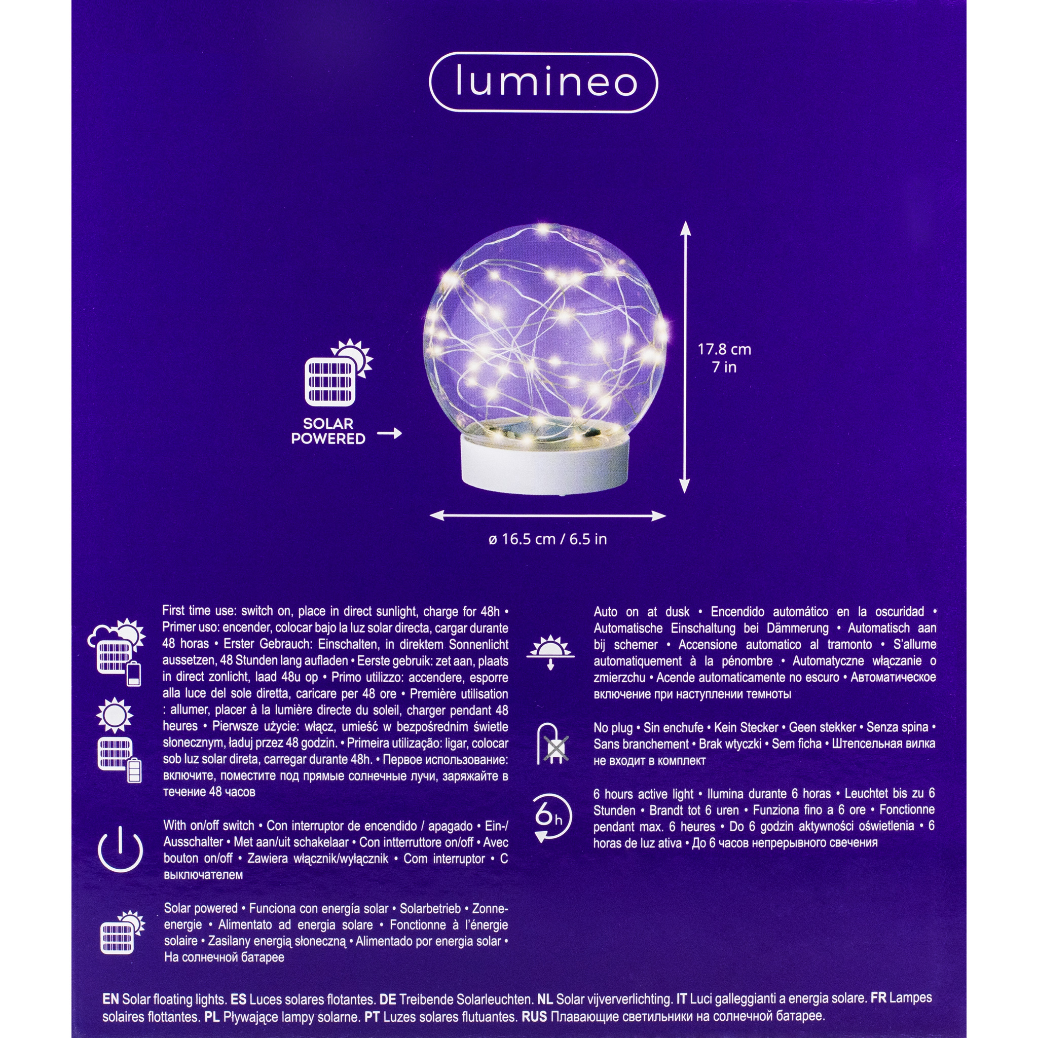 PRODUKT: LED Leuchtkugel für Außen / INHALT: 1 LED Solarleuchte / GRÖSSE (DxH): ca. 16,5 x 17,8 cm / MATERIAL: Kunststoff - Acryl / FARBE: klar transparent