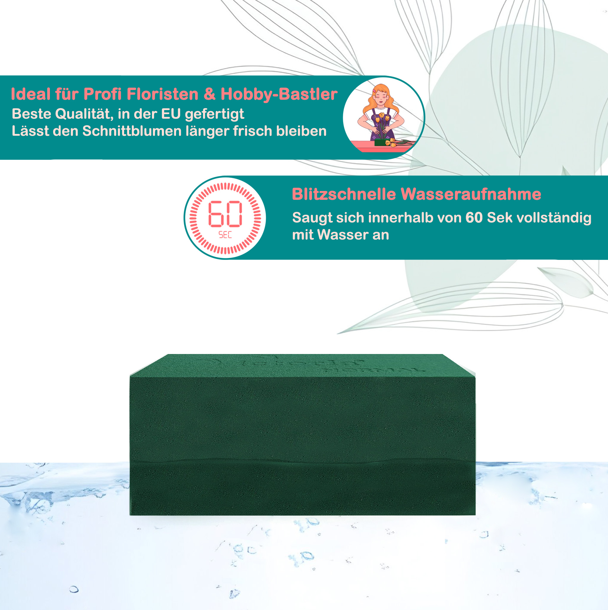 WERTVOLLE TIPPS: Für gleichmäßige Durchfeuchtung den Blumensteckschaum aufs Wasser legen und eigenständig vollsaugen lassen. Nicht unter Wasser drücken, um Wasseraufnahme nicht zu behindern
